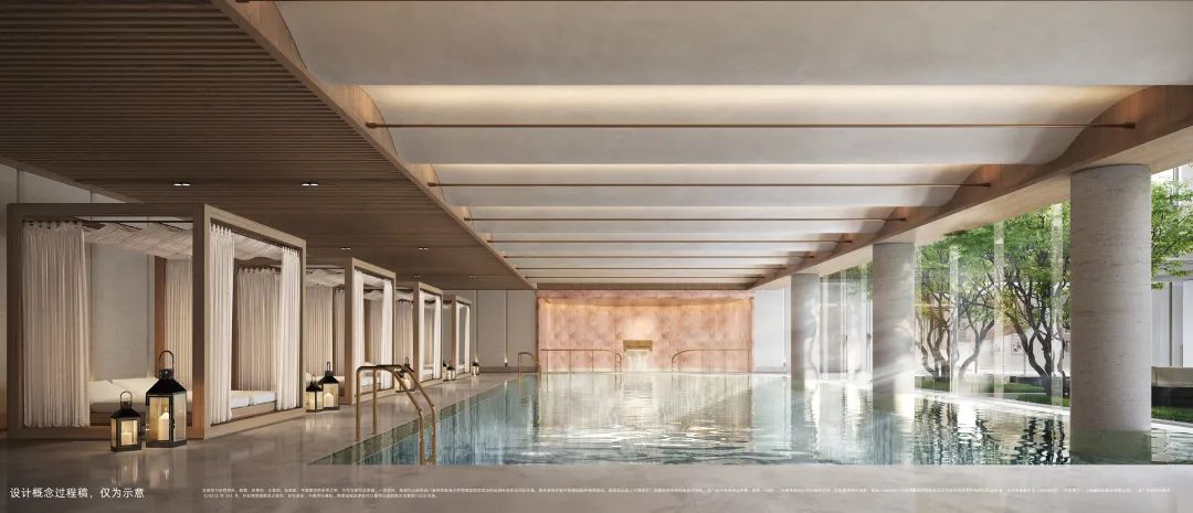 尤其是光廊设计引入室外阳光,泳池游泳也能享受阳光温暖,进一步将尊贵体验感拉满。