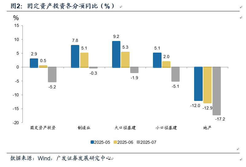 7月固定资产投资当月同比-5.2%,前值为增长0.5%;其中,制造业投资当月同比-0.3%,前值5.1%;大口径基建投资当月同比-1.9%,前值5.3%;小口径基建投资当月同比-5.1%,前值2.0%;地产投资当月同比-17.2%,前值-12.9%。
