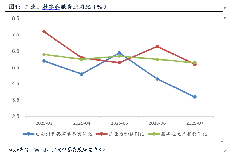正文 ]article_adlist-->7月经济数据呈现一定的放缓特征。六大口径中只有出口加速,工业、服务业、消费、投资、地产销售单月同比均低于前值,即内外需分化出现。按照工业增加值和服务业生产指数估算的实际GDP指数同比约为5.02%,按照工业增加值和社零估算约为4.79%,均不同程度低于二季度。